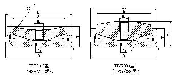 該類軸承是專用軸承,是為軋鋼機壓下機構專門設計的,軸承無保持架滿裝滾子,允許的轉速極低,軸向負荷能力很大,為滿足軋鋼機壓下機構工作要求,該類軸承的頂圈頂端加工成凸球面TTSX000型(4297/000型)或凹球面TTSV000型(4397/000型),以保證其調心性能,同其他相配合的異型端面接觸均勻,在壓下機構相對軸承軸線產生一定傾斜時能保證軸承受力均勻。